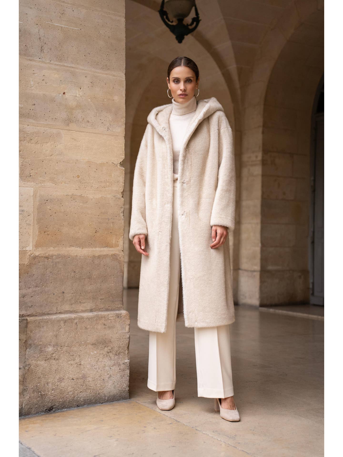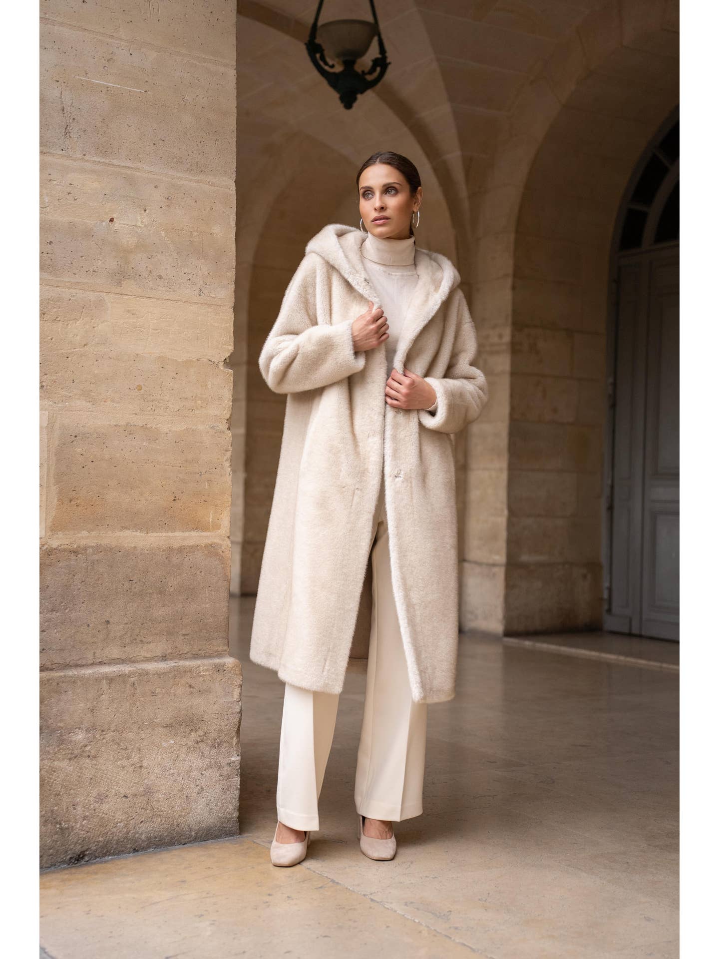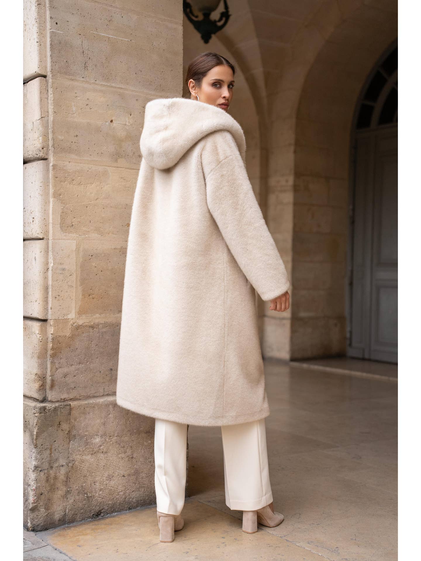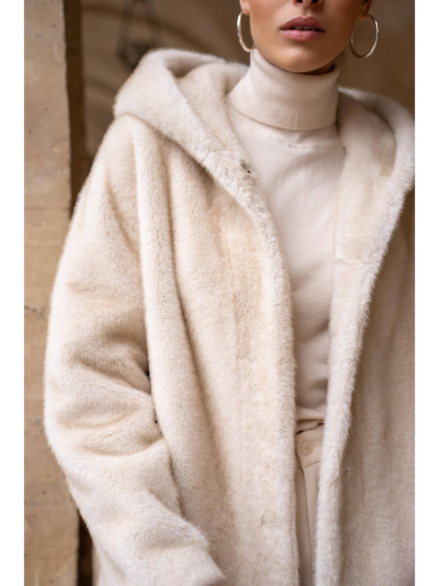 Ontdek de **Arden Jas**, een lange jas van hoogwaardig imitatiebont die warmte en tijdloze elegantie uitstraalt. De geïntegreerde omslagcapuchon en rechte, vloeiende snit zorgen voor een luxueuze uitstraling, terwijl de glanzende textuur en ultrazachte aanraking ultiem comfort bieden. Afgewerkt met discrete zijzakken en een ton-sur-ton sluiting aan de voorkant, is deze jas perfect voor stijlvolle winterlagen.