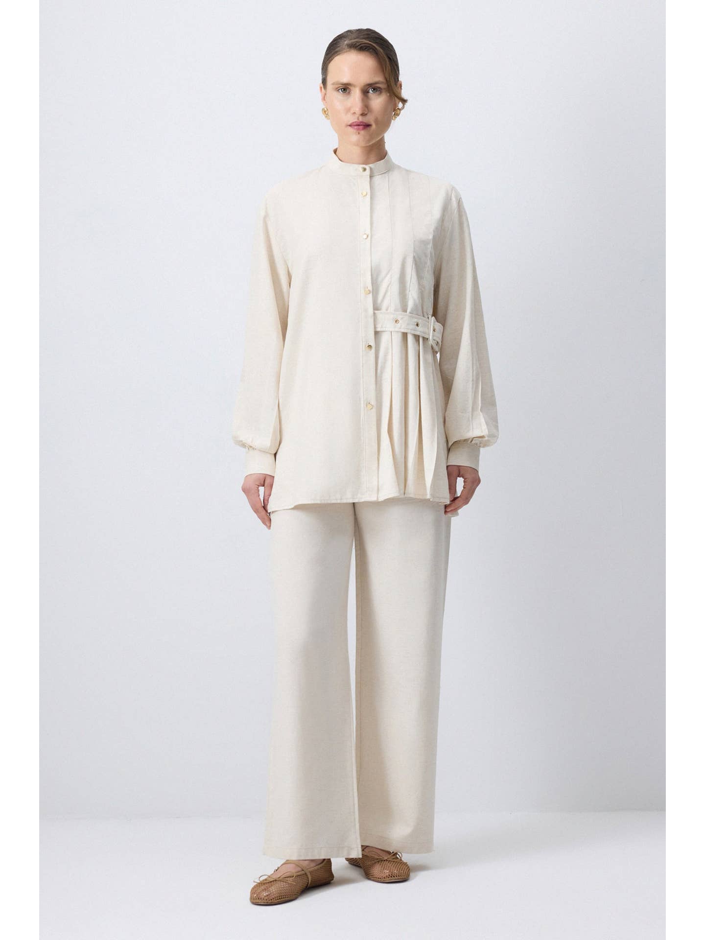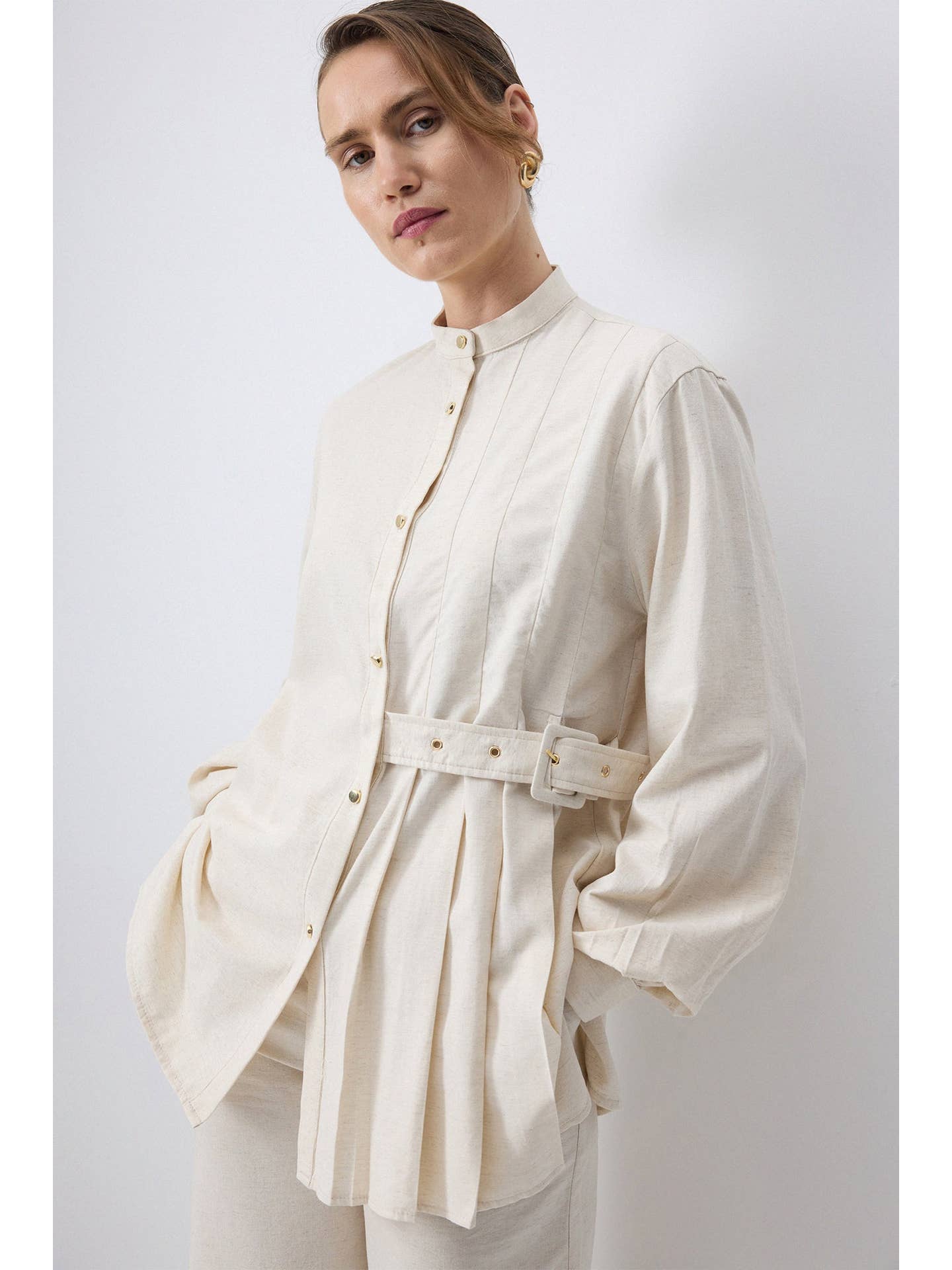 De blouse is afgewerkt met verfijnde plooien aan één kant, een opstaande kraag en ballonmouwen met omgeslagen zomen. De tonale riem met gespdetail accentueert subtiel de taille zonder in te boeten aan comfort.