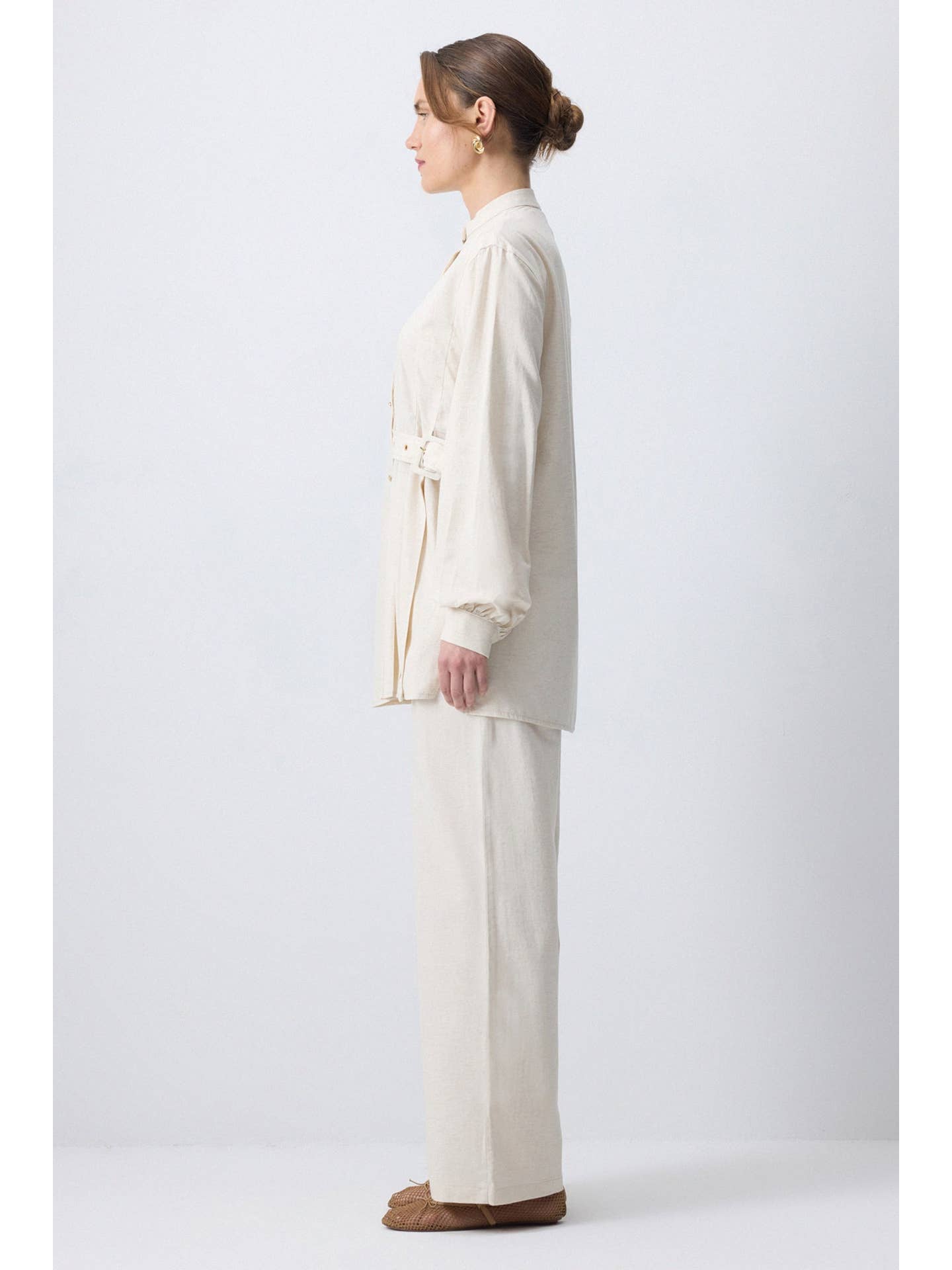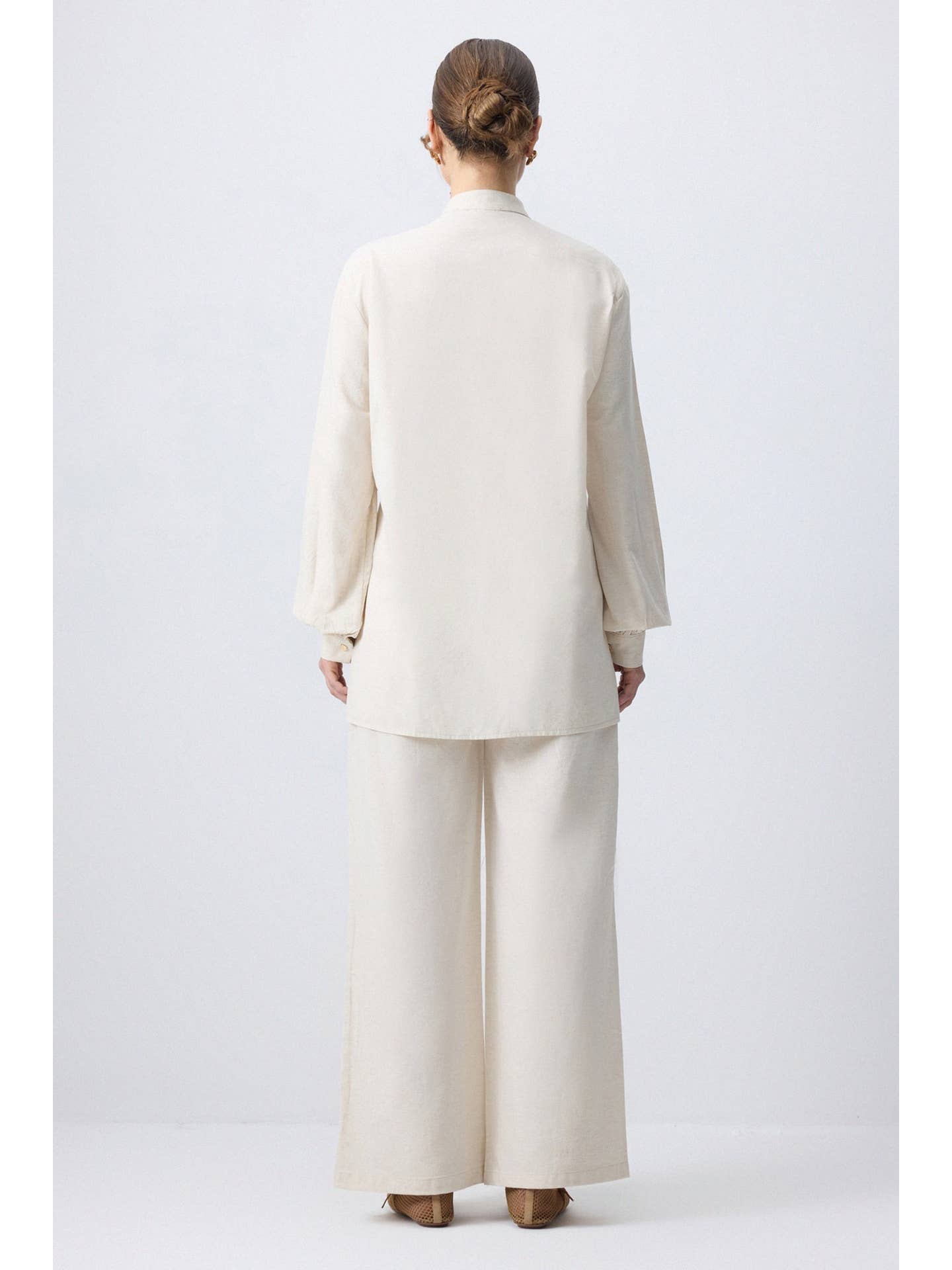 De bijpassende wijde broek met hoge taille en vloeiende pijpen biedt volledige bedekking en een ontspannen pasvorm. Samen vormen ze een veelzijdige co-ord die ideaal is voor dagelijks gebruik, werk, brunch of reizen.