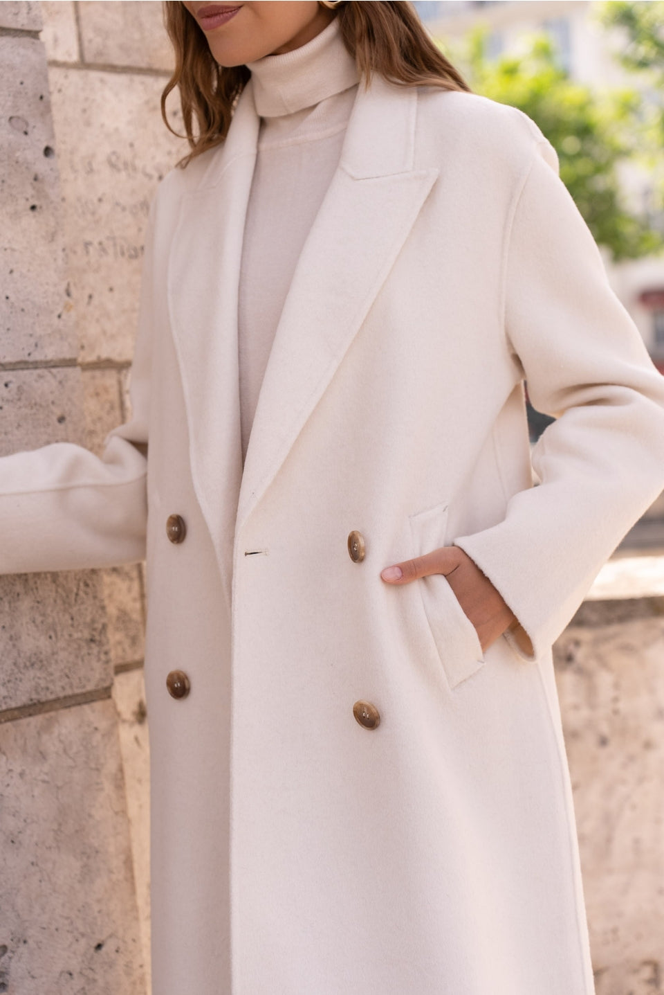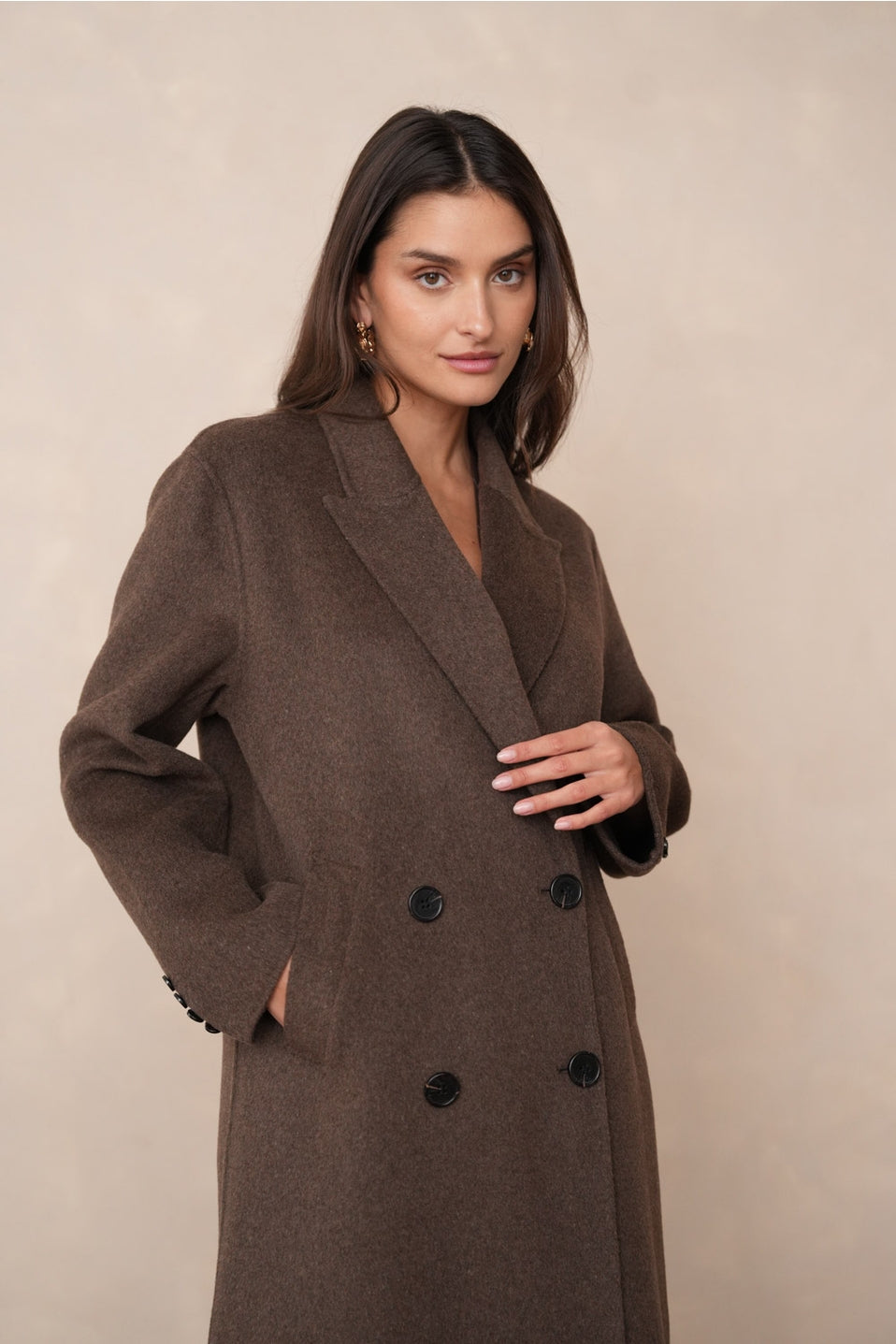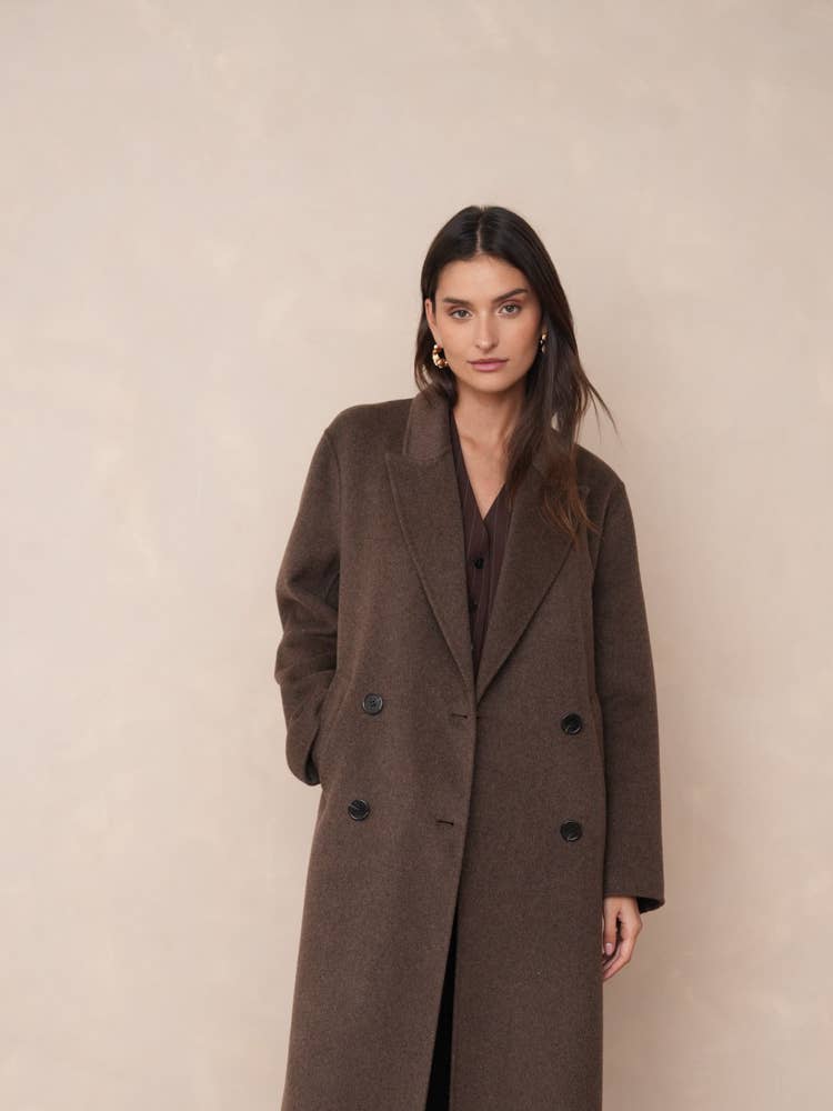 De **Élodie Jas** belichaamt klassieke luxe en verfijning. Deze extra lange, oversized jas is met de hand vervaardigd uit een hoogwaardige wolmix voor ultieme warmte en comfort. De dubbele kruisknoop in dezelfde tint, discrete zijzakken en vloeiende drapering geven deze jas een tijdloze elegantie met een moderne touch.