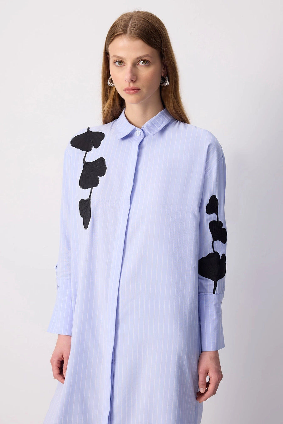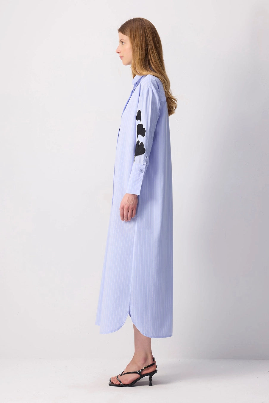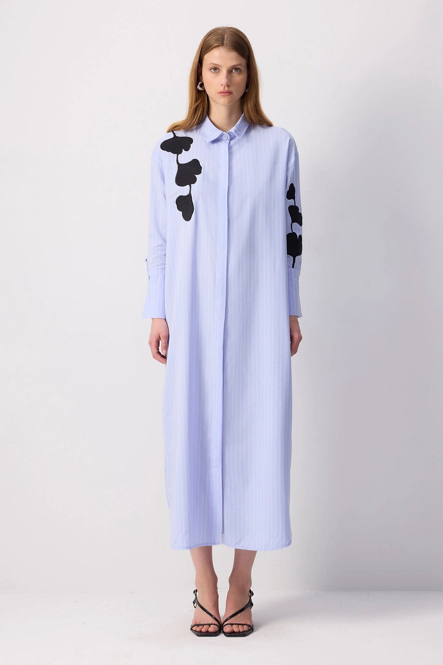 Een verfijnde twist op de klassieke overhemdjurk: dit lange ontwerp is vervaardigd uit een ademende katoen-polyester mix met subtiele zachtblauwe krijtstrepen. De oversized zwarte botanische borduursels op schouder en mouw geven het een gedurfde, maar toch elegante uitstraling.