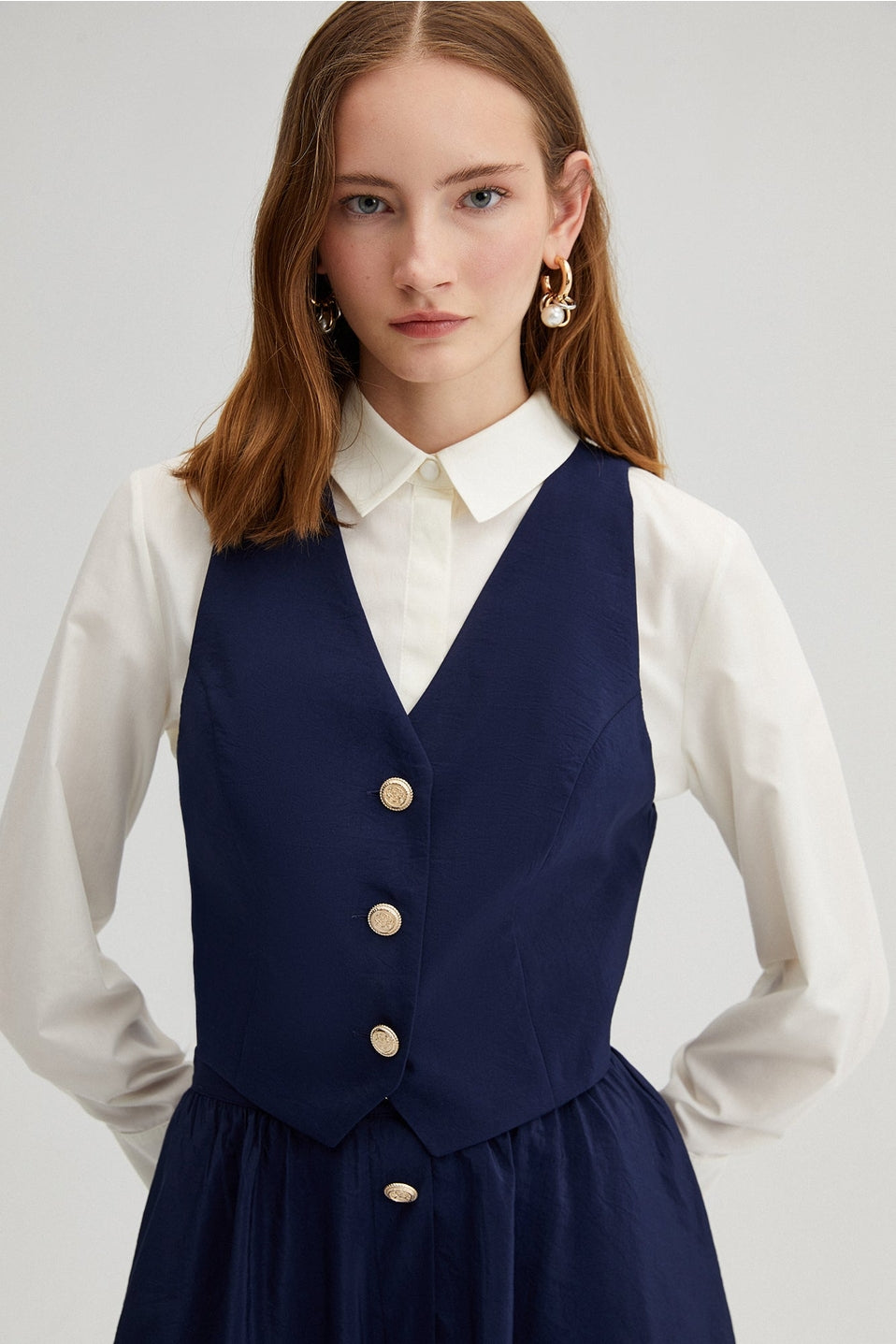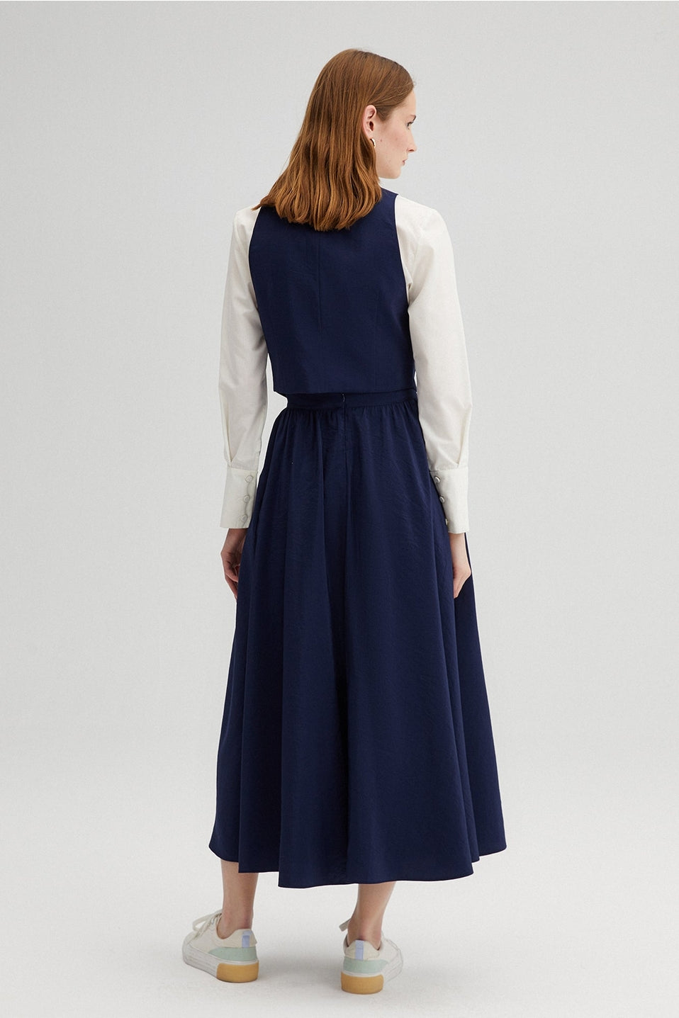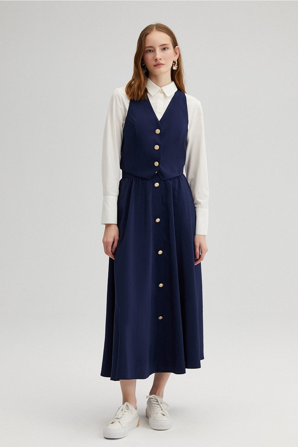 Verhoog je bescheiden garderobe met deze marineblauwe vest- en rokset met knoopsluiting, vervaardigd van ademende cuprostof. De set bestaat uit een op maat gemaakt vest met een slanke V-hals en een vloeiende A-lijn rok, en biedt zowel structuur als beweging.