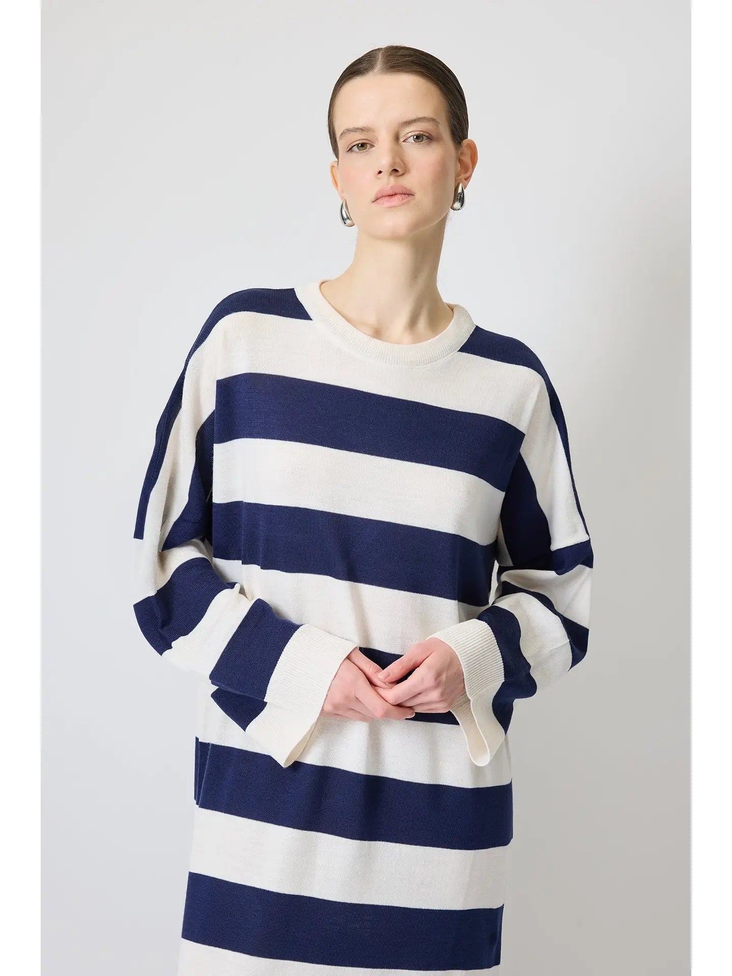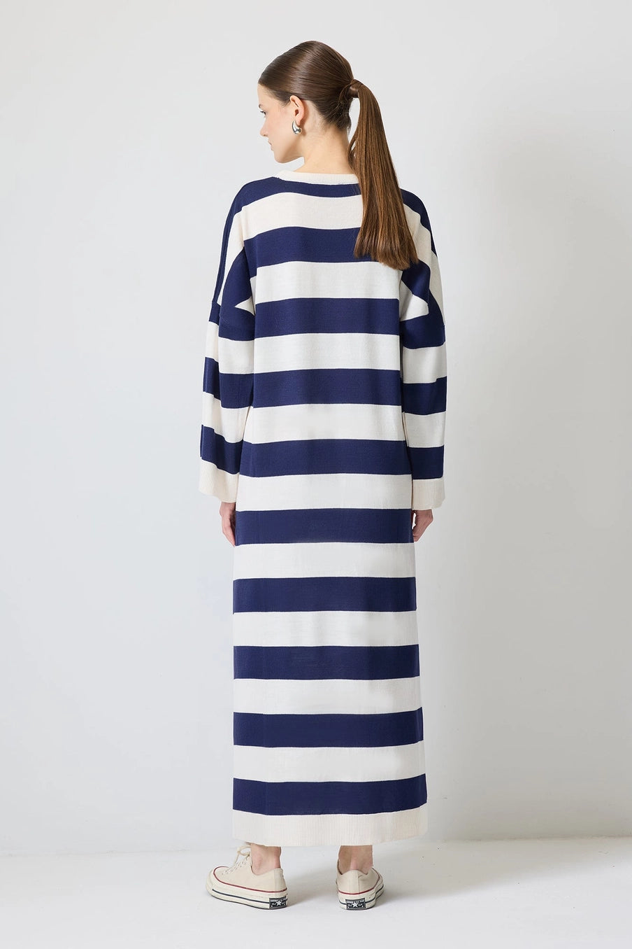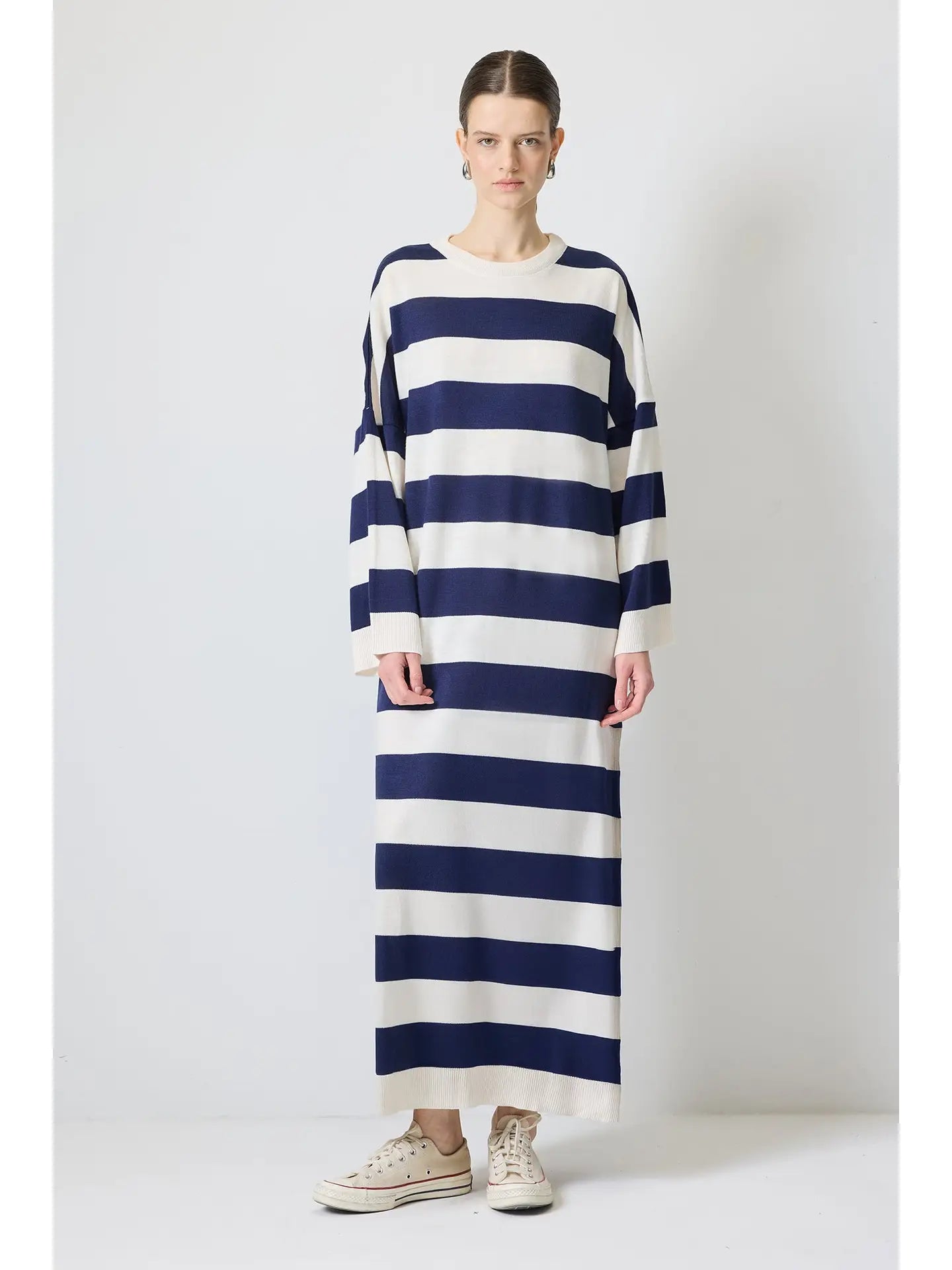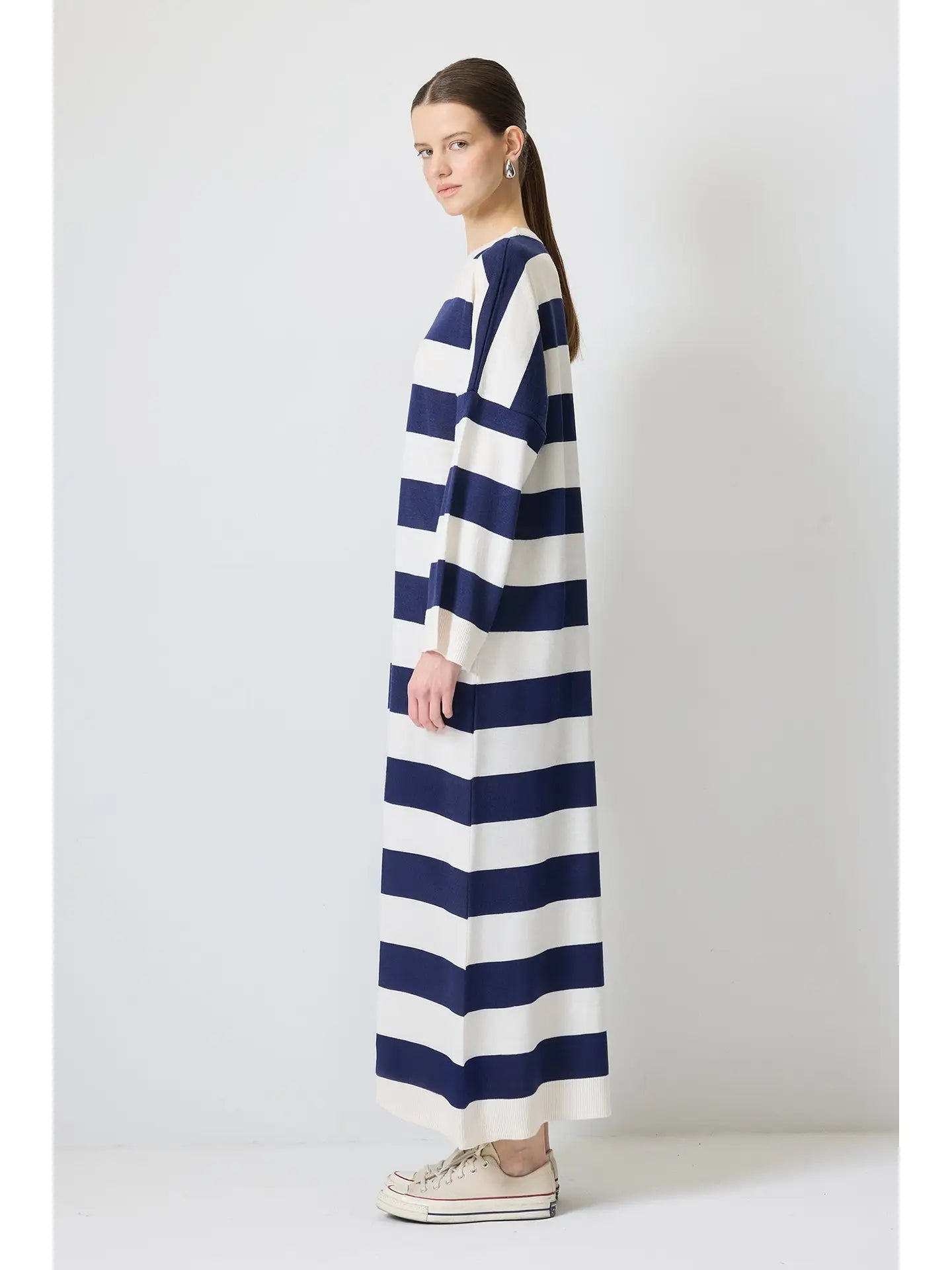 Deze lange gebreide jurk is de perfecte combinatie van comfort en casual stijl. Met een lengte van 128 cm en een losvallende pasvorm is dit een veelzijdig item dat moeiteloos met je meebeweegt. De horizontale strepen geven de jurk een speels karakter, terwijl de zachte acrylstof zorgt voor een prettig draaggevoel, licht en soepel zonder zwaar aan te voelen.