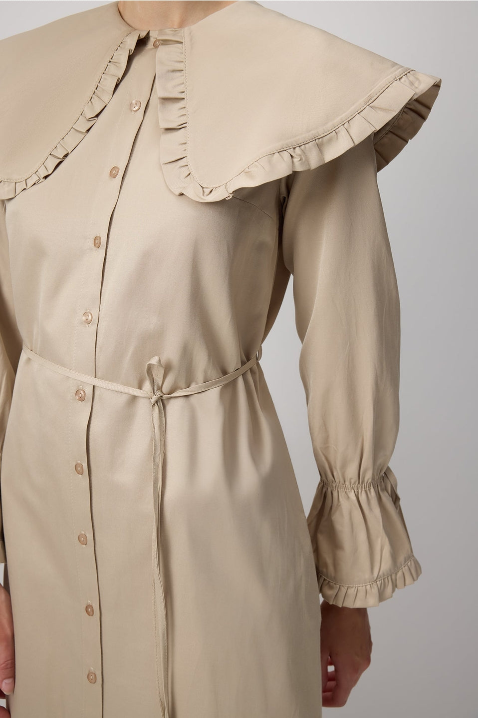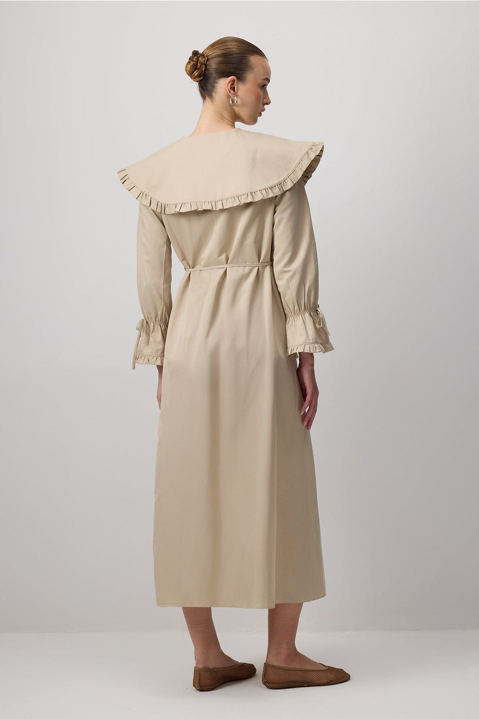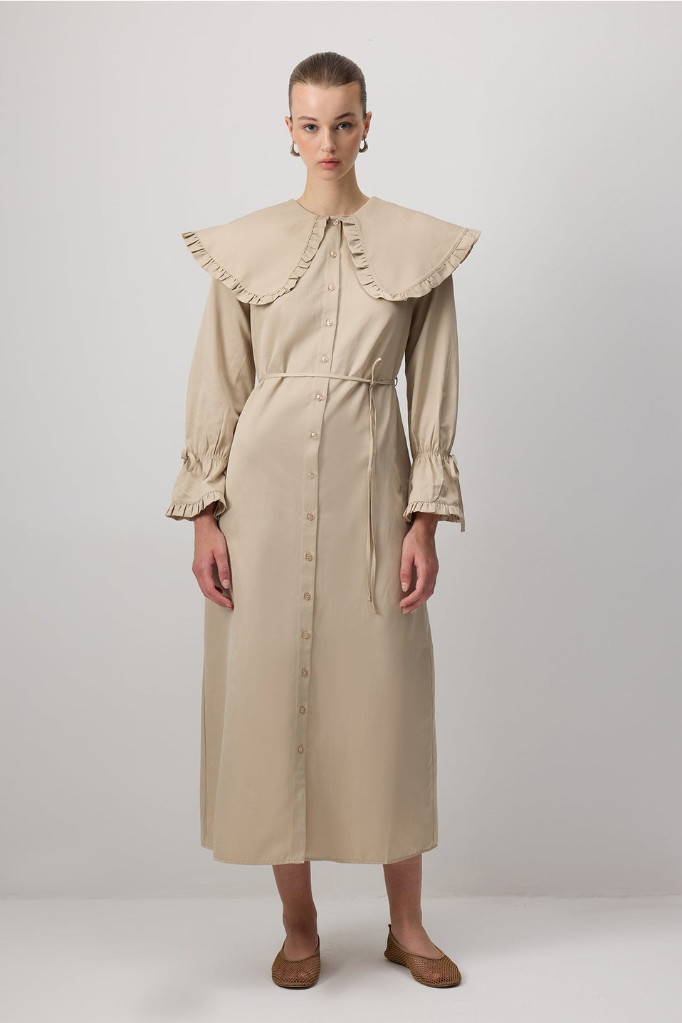 Deze stijlvolle maxi jurk combineert een moderne snit met een bescheiden, elegante uitstraling. De lange lengte en volle mouwen maken de jurk ideaal voor modest fashion, terwijl de opvallende kraag met ruches zorgt voor een trendy detail. Gemaakt van een zachte katoen-polyester mix die comfortabel draagt en mooi in model blijft.