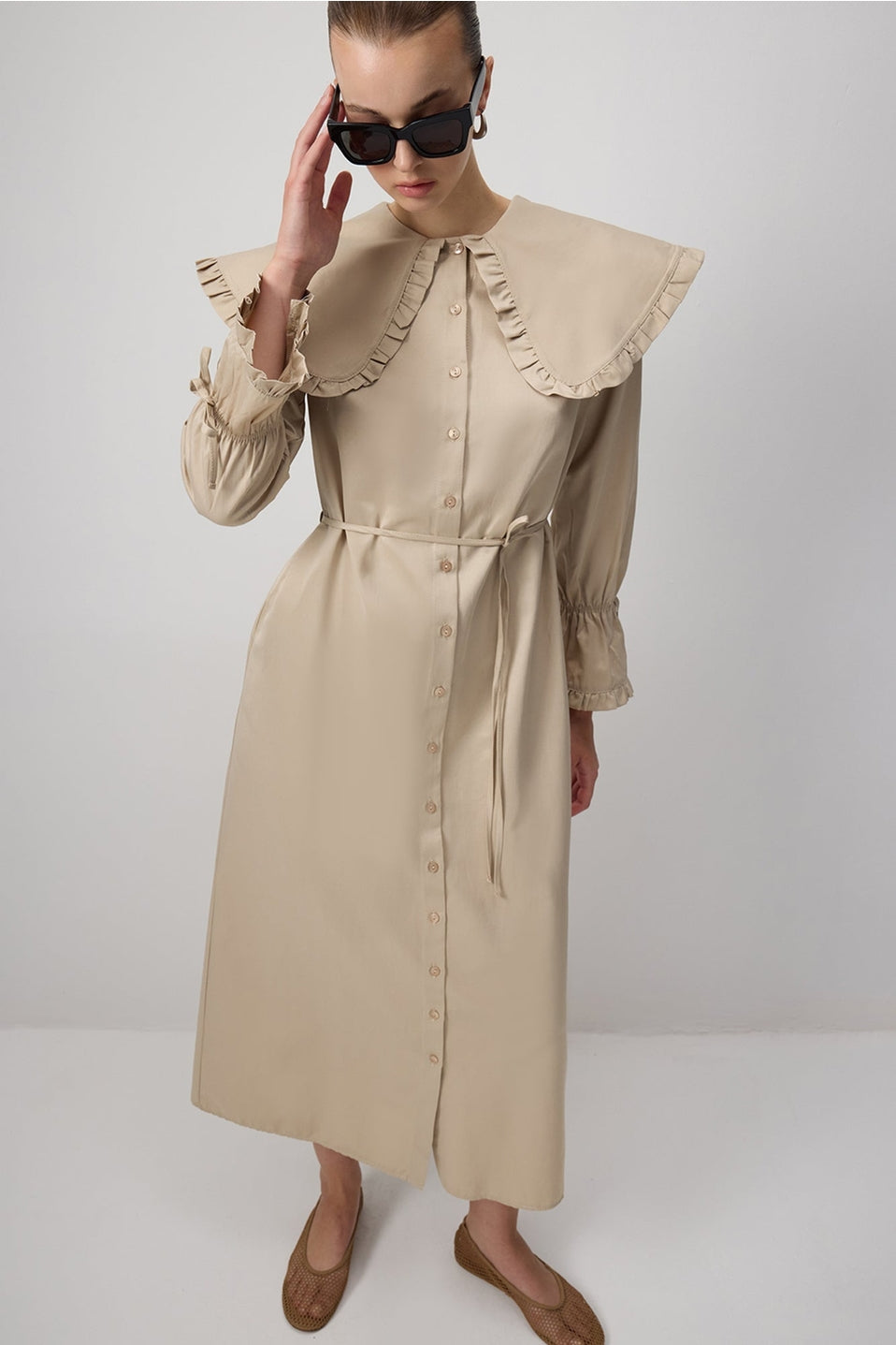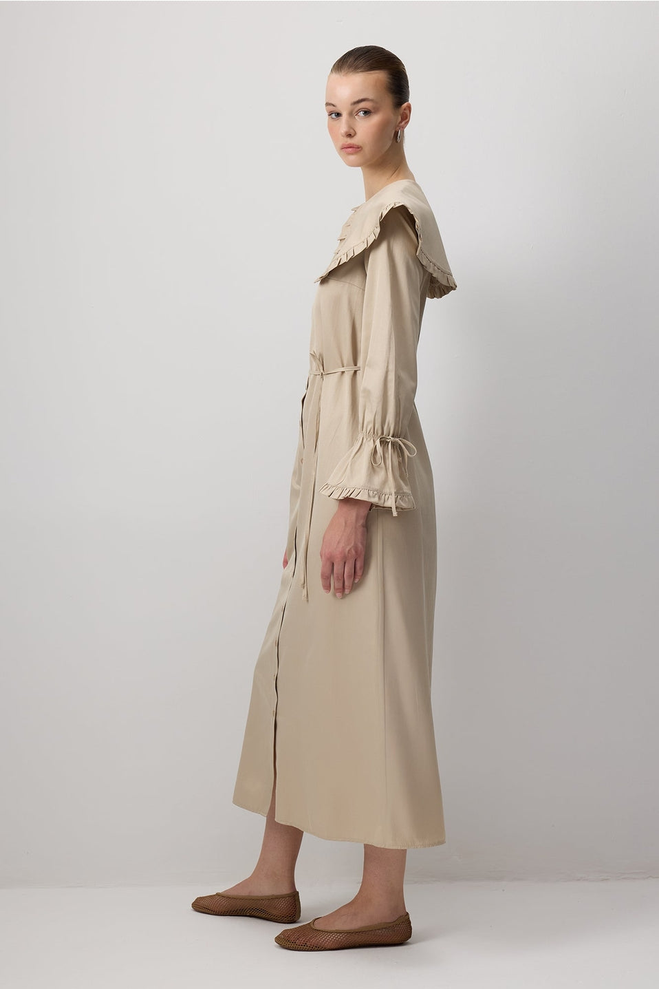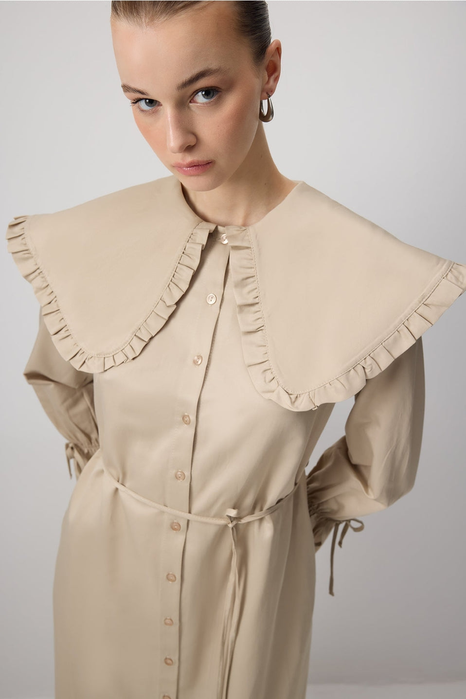 Deze stijlvolle maxi jurk combineert een moderne snit met een bescheiden, elegante uitstraling. De lange lengte en volle mouwen maken de jurk ideaal voor modest fashion, terwijl de opvallende kraag met ruches zorgt voor een trendy detail. Gemaakt van een zachte katoen-polyester mix die comfortabel draagt en mooi in model blijft.