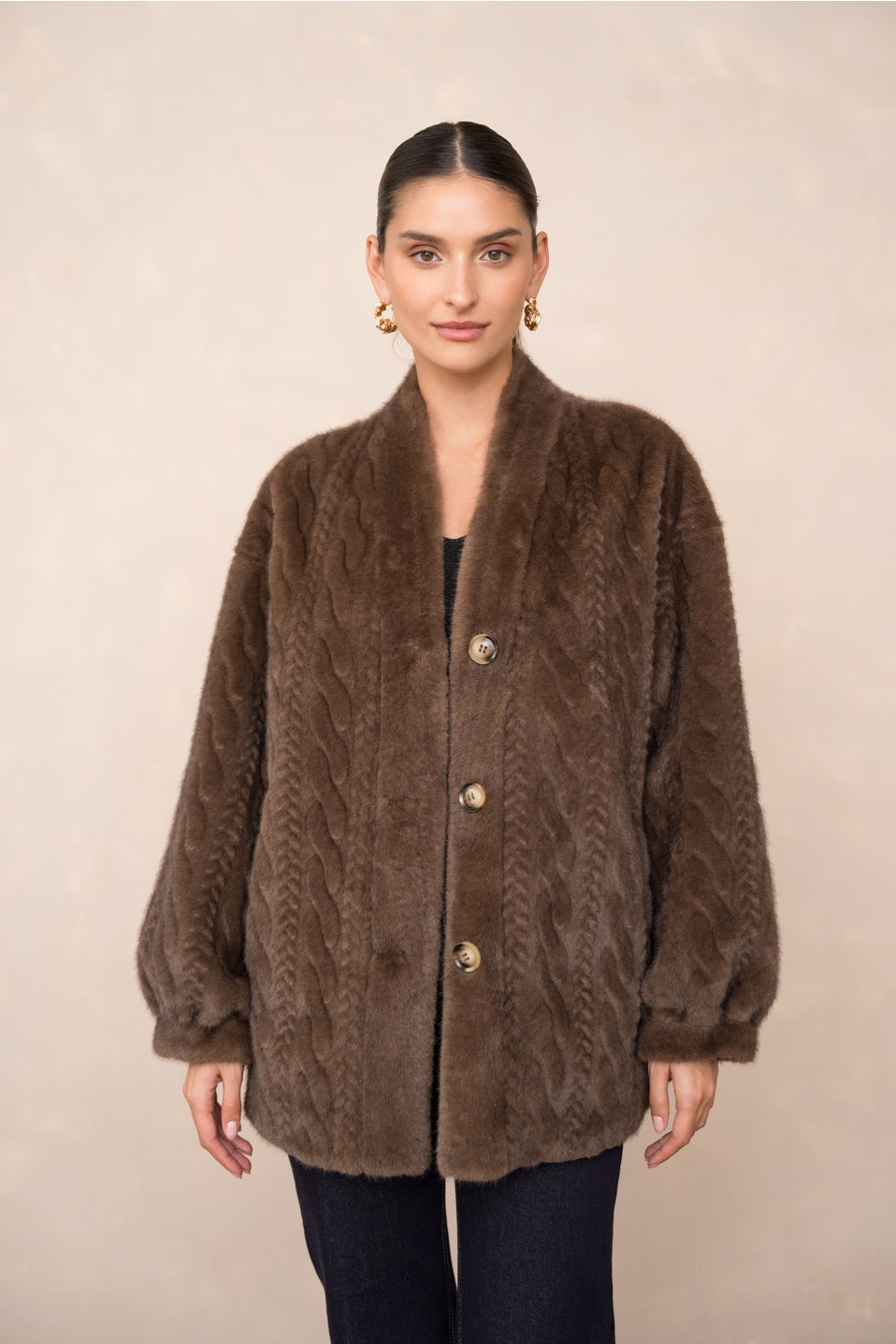 Omhul jezelf in warmte en elegantie met het **Sienna Vestjack**, vervaardigd uit hoogwaardig synthetisch bont in een rijke, aardse bruintint. De subtiele gedraaide textuur geeft het jack een luxueuze uitstraling, terwijl de losse pasvorm en knoopsluiting zorgen voor comfort en veelzijdigheid. Perfect voor de koudere seizoenen.