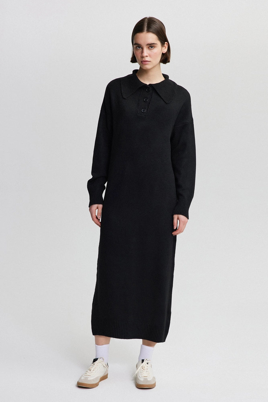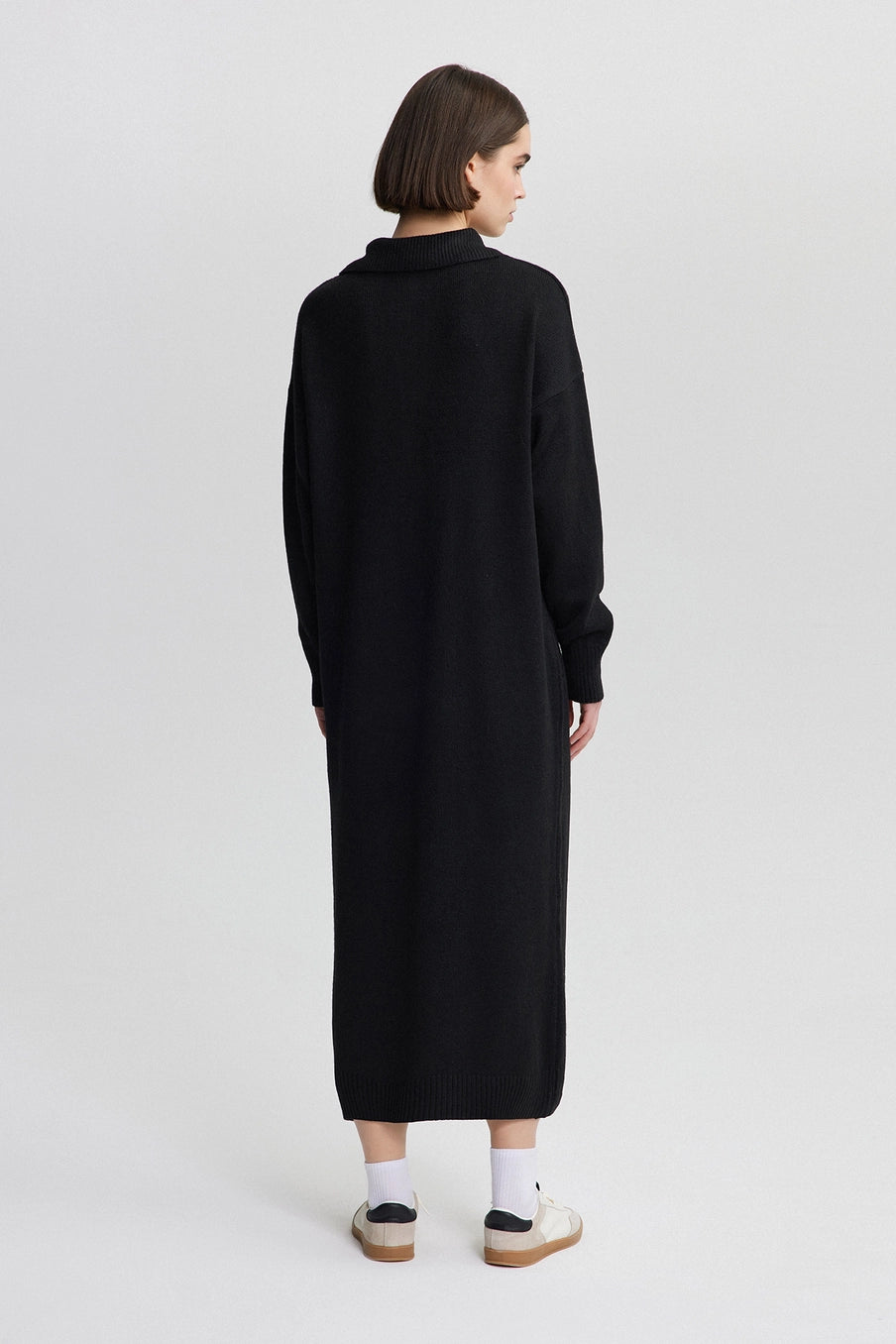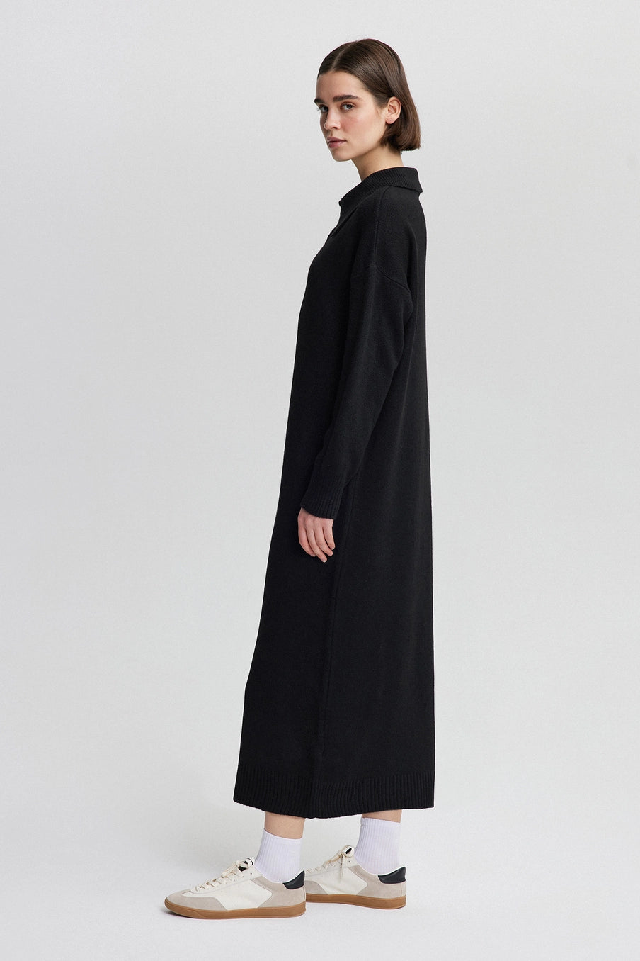 Deze lange zwarte gebreide jurk combineert moeiteloos comfort met tijdloze elegantie. Gemaakt van een zachte mix van 73% acryl en 27% polyester, voelt de jurk heerlijk soepel aan en biedt ze een ontspannen, toch verfijnde pasvorm.