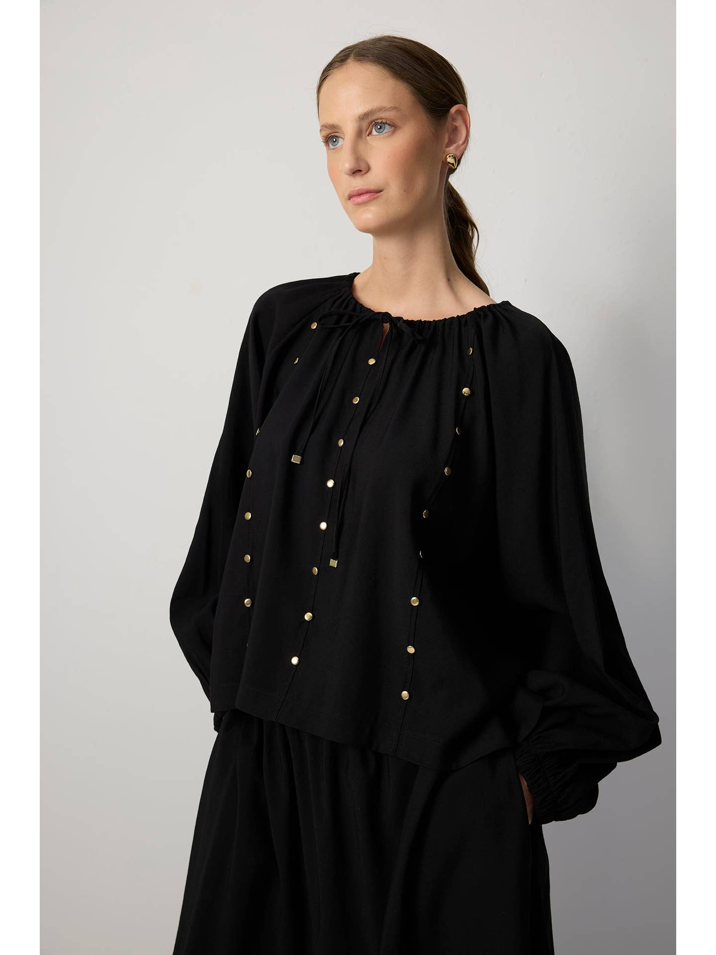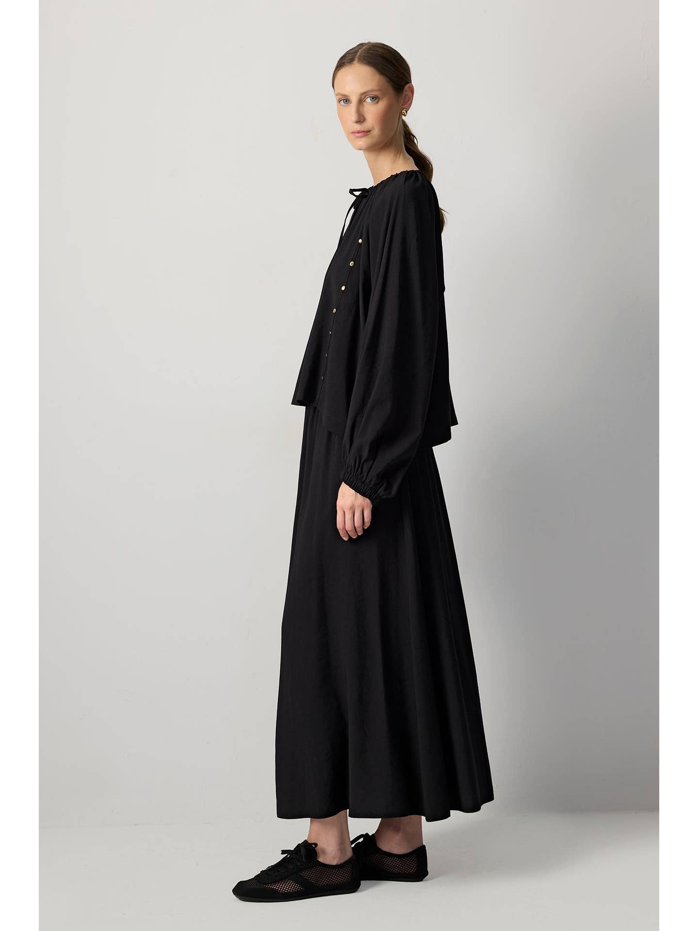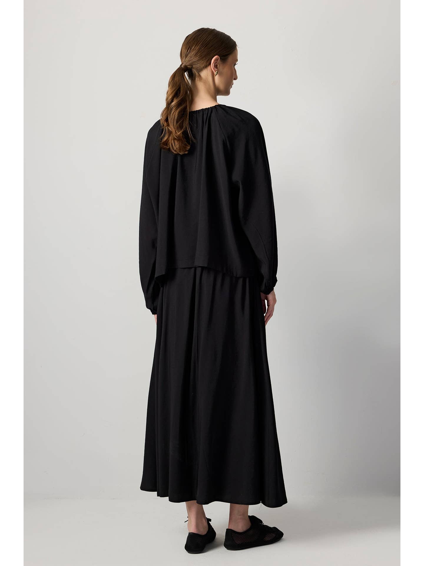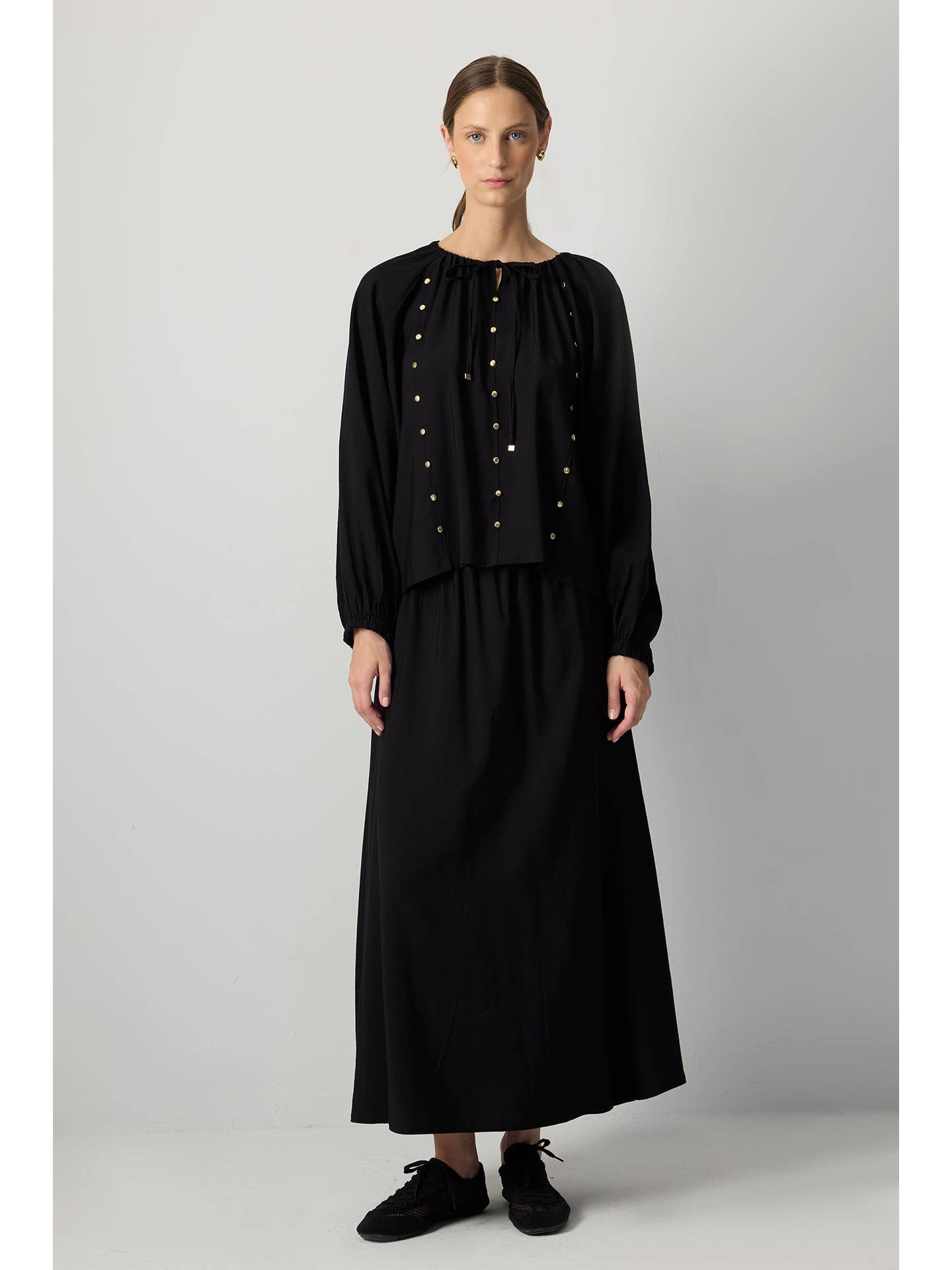 Verhoog je garderobe met deze elegante zwarte co-ord set, bestaande uit een blouse met ballonmouwen en een vloeiende maxi-rok. De blouse is ontworpen met een ontspannen pasvorm, een ronde halslijn en verfijnde goudkleurige studs die een vleugje luxe toevoegen. De subtiele plooien aan de hals en de elastische manchetten creëren een moeiteloos vrouwelijke uitstraling.